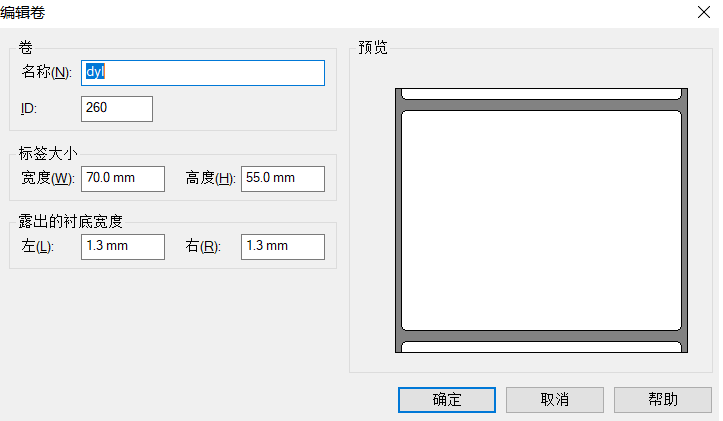 4.在编辑卷页面,将标签名称设置为“达意隆标签”,然后标签大小根据实际测量进行设置,建议宽度设置70mm,高度设置55mm,确认后点击【确认】按钮