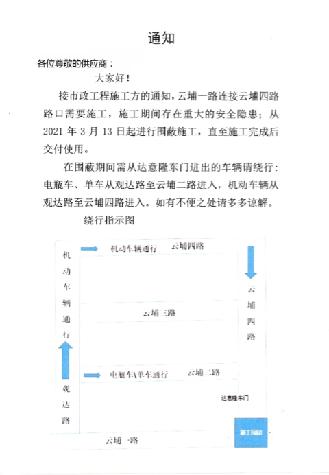 绕行 观达路至云埔四路 送货通知